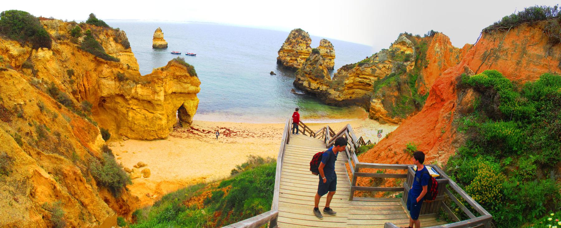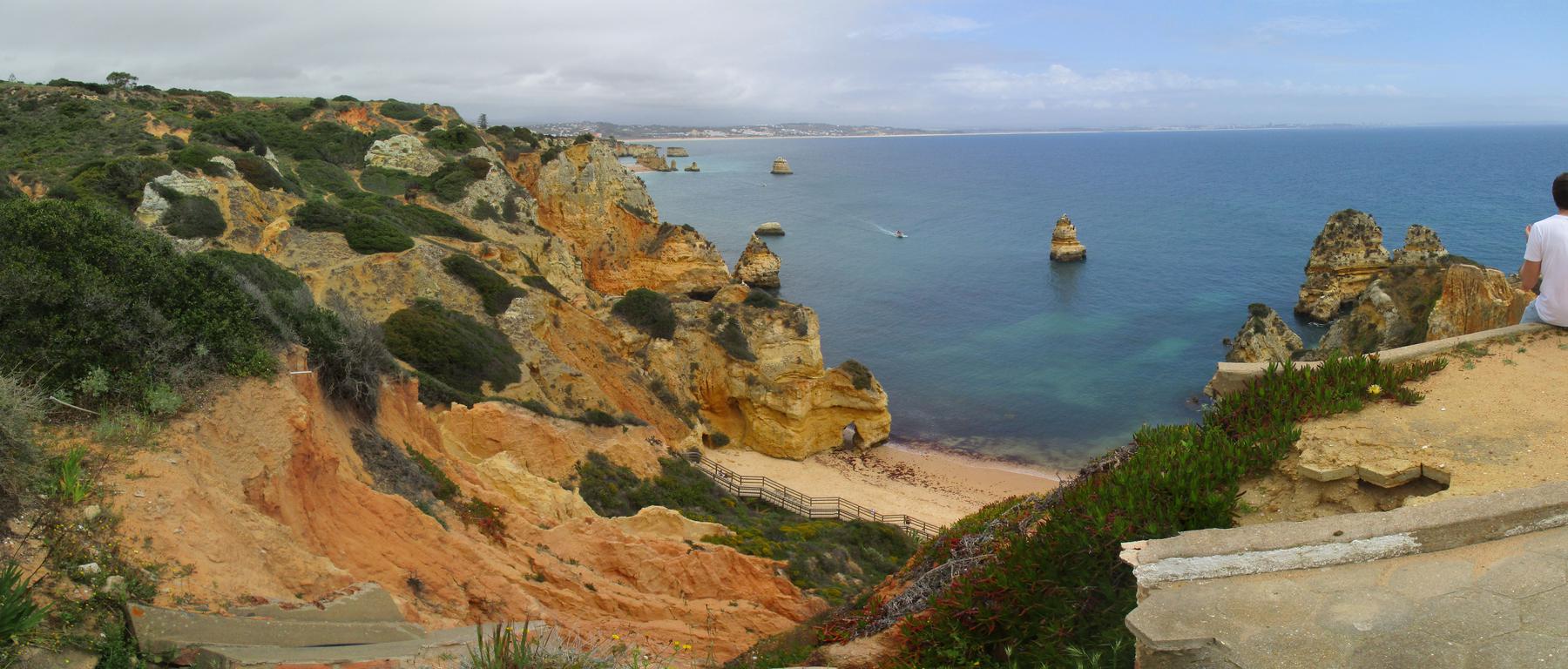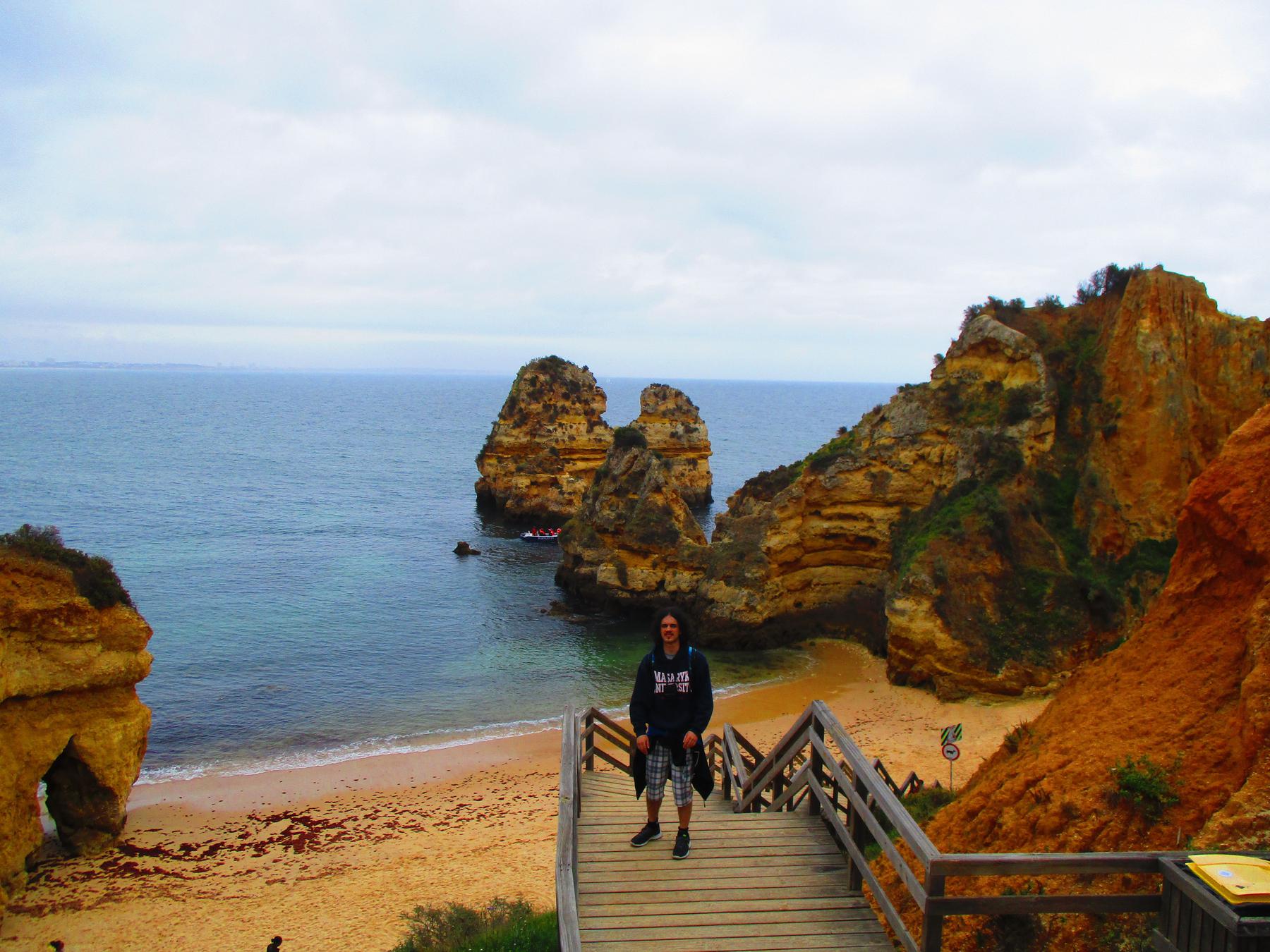 Cesta sa na chvíľu vzdiali od pobrežia ale čo nevidieť dorážame do druhého významného bodu - pláž Praia do Camilo. Najskôr zvrchu obdivujeme toto prírodné dielo, potom po kľukatých drevenných schodoch zchádzame až dole. Pofotíme čo sa dá a pokračujeme k nášmu cieľu - útes Farol da Ponta da Piedade.