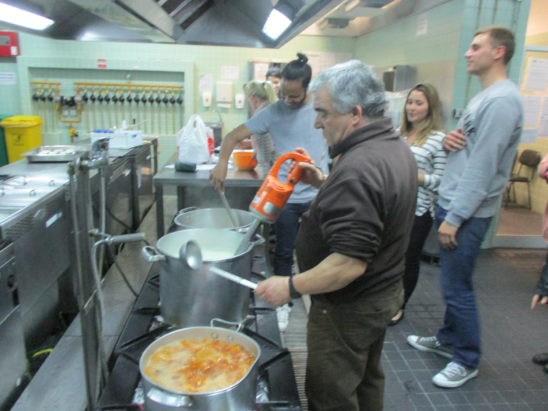 Stretli sme sa v jednej školskej jedálni v centre mesta, rozdelili do skupiniek čo by kto chcel variť a začali sme. Ja som sa dostal do skupinky, kde sa šla variť tradičná portugalska polievka. Najskôr sme očistili pár zemiakov a cibúľ. Potom sme to všetko dali do vriacej vody a nechali rozvariť. Keď to bolo rozvarené, prišiel ujo s mixerom a všetko rozmixoval. Ešte sme pridali trošku soli a polievka bola hotová. Ahá, veď toto je presne polievka "bez chuti", ktorá je každý deň v menze.