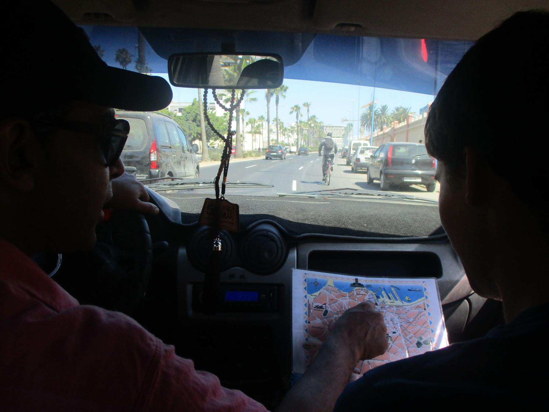 Takže ideálnou možnosťou je nasadnúť na bus. Ideme preto na zastávku autobusu a čakáme. No nič nechodí. Na zastávku príde jedna venezuelčanka a tá hovorí, že už viac krát takto ide a že autobus príde. Avšak ani po dlhšej dobe nič nechodí. Spýtame sa jedného SBS-kára ktorý je poblíž a ten nám len povie: Chlapci chlapci, posledný autobus už odišiel jediná možnosť je zobrať si to biele taxi za 200 dirhamov(20€) - Juj, len to nie. Mali sme 2 rôzne odpovede a ktorej teda veriť ? Nejako sa mi podarilo pripojiť sa na wifi z letiska a SBS-kár mal pravdu, autobus vždy chodí hodinu po prílete a keďže my sme boli až na konci fronty na colnicu autobus odišiel bez nás (Fail 10). Venezuelčanka chcela ísť tiež do centra, tak sme sa spojili a šli na tretiny. Ona ale chcela ísť na hlavnú stanicu, tak sme povedali taxíku, že chceme ísť tam(tam by nás tiež doviezol autobus) a odtiaľ sme si šli zobrať modré taxi podľa inštrukcii z mailu. Daný vodič bodužiaľ nepoznal krčmu Super Titi Marche a ani ďalších 10 vodičov čo šli okolo. (Fail 11 - ano všetci taxikári poznajú túto krčmu :D). Bolo mu preto namáhavé vysvetliť kam má ísť, ale nakoniec to nejako zvládol a niekde nás vysadil, že tu blízko by to malo niekde byť. Vystúpime z auta, všade skoro tma, iba sem tam niekde lampa, množstvo mládeže an uliciach... trošku sme sa báli, či náhodou nožíky nenosia pri sebe.