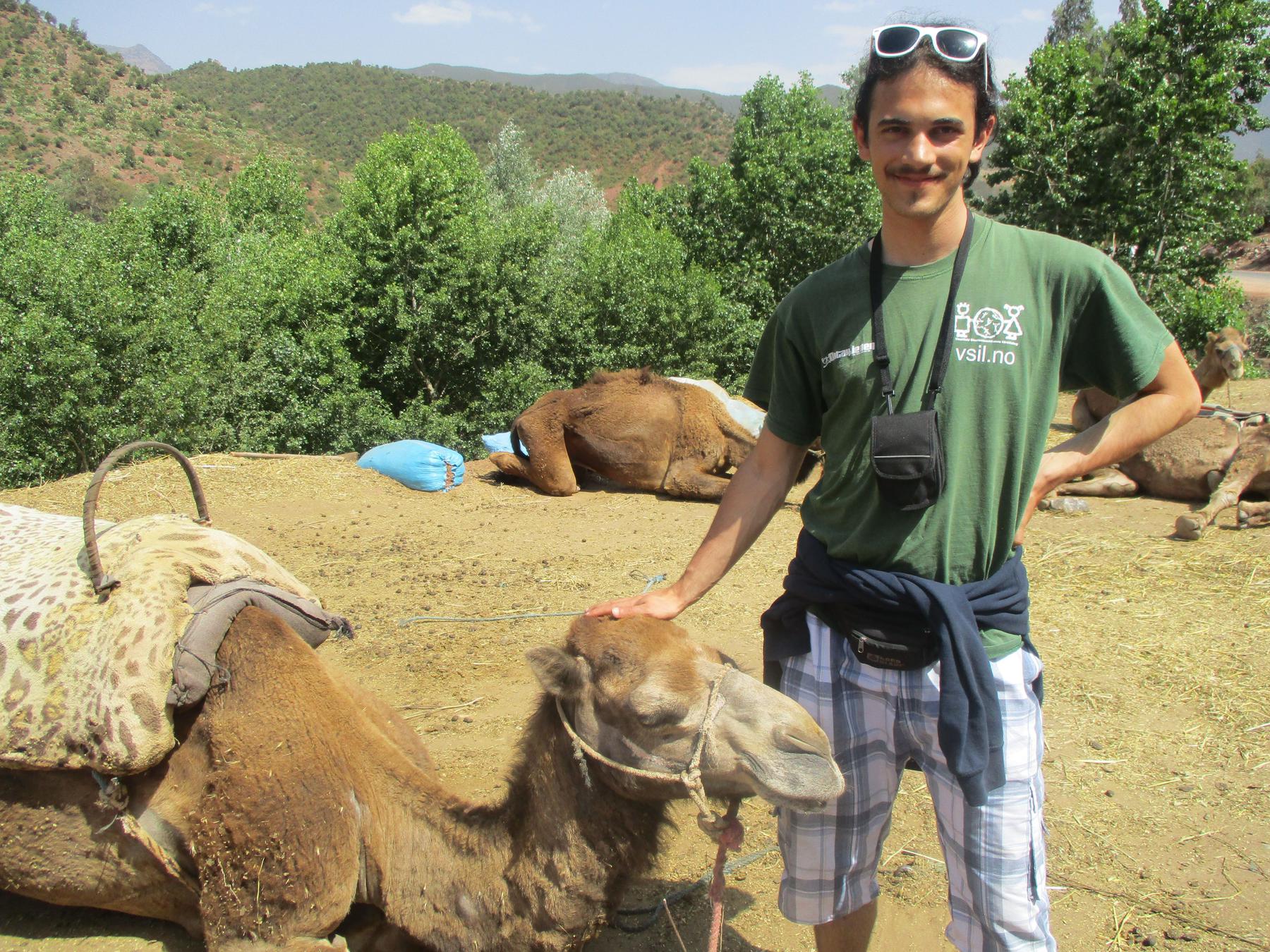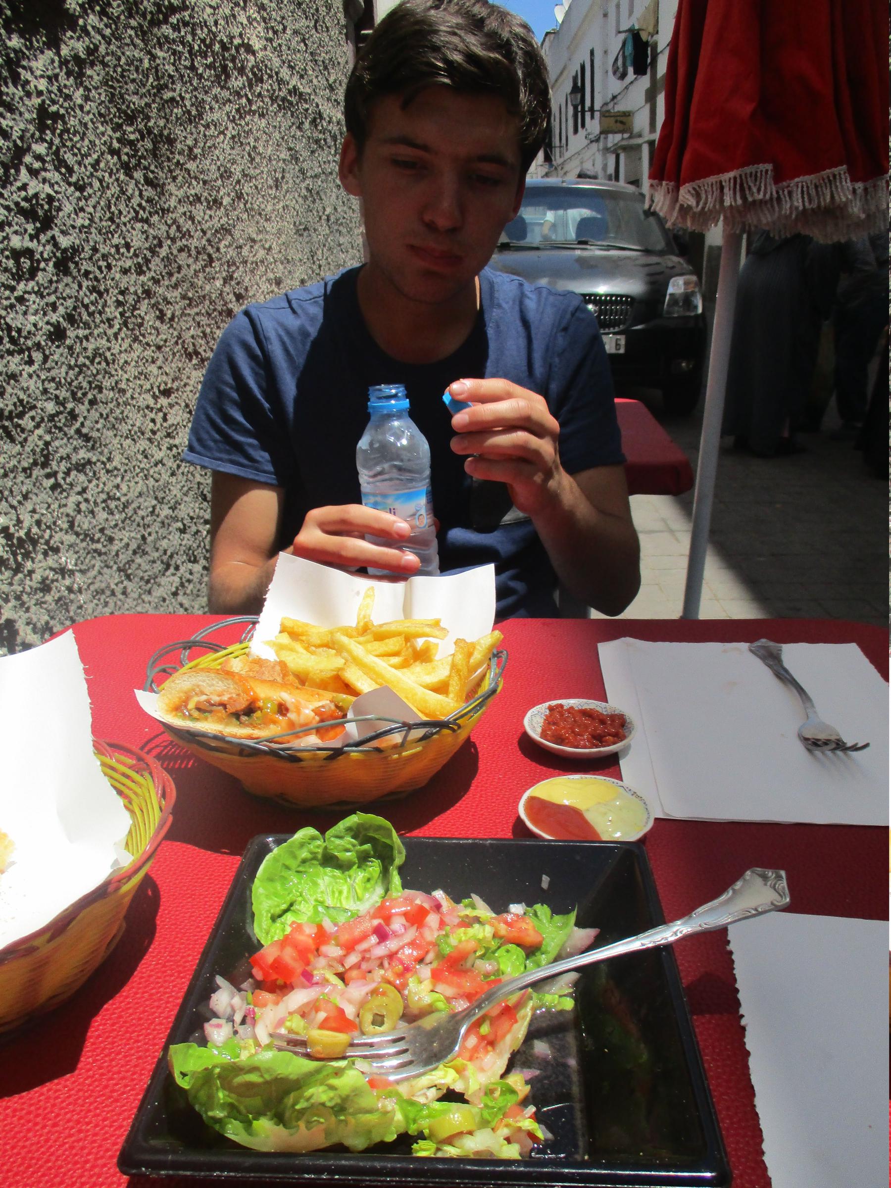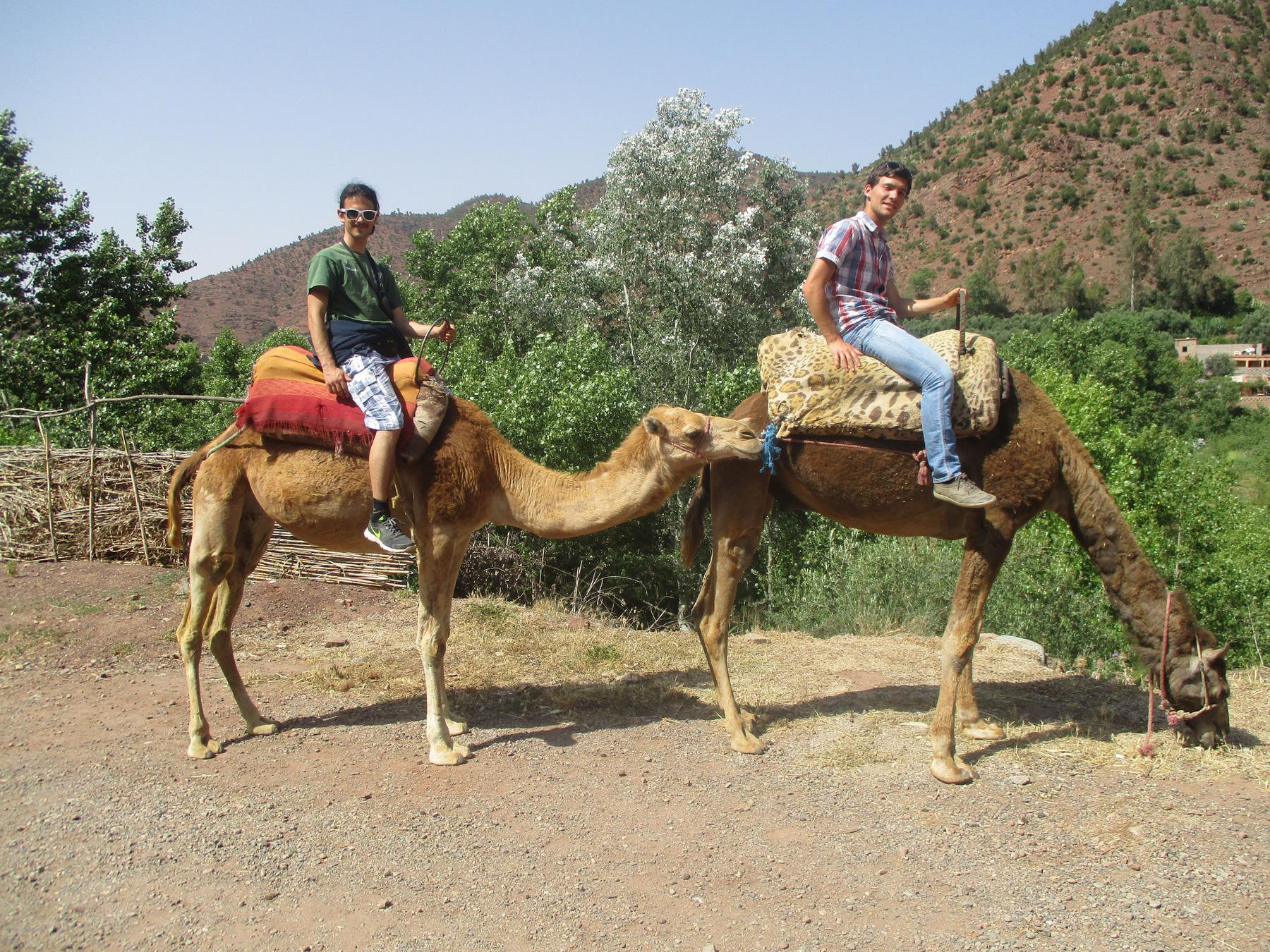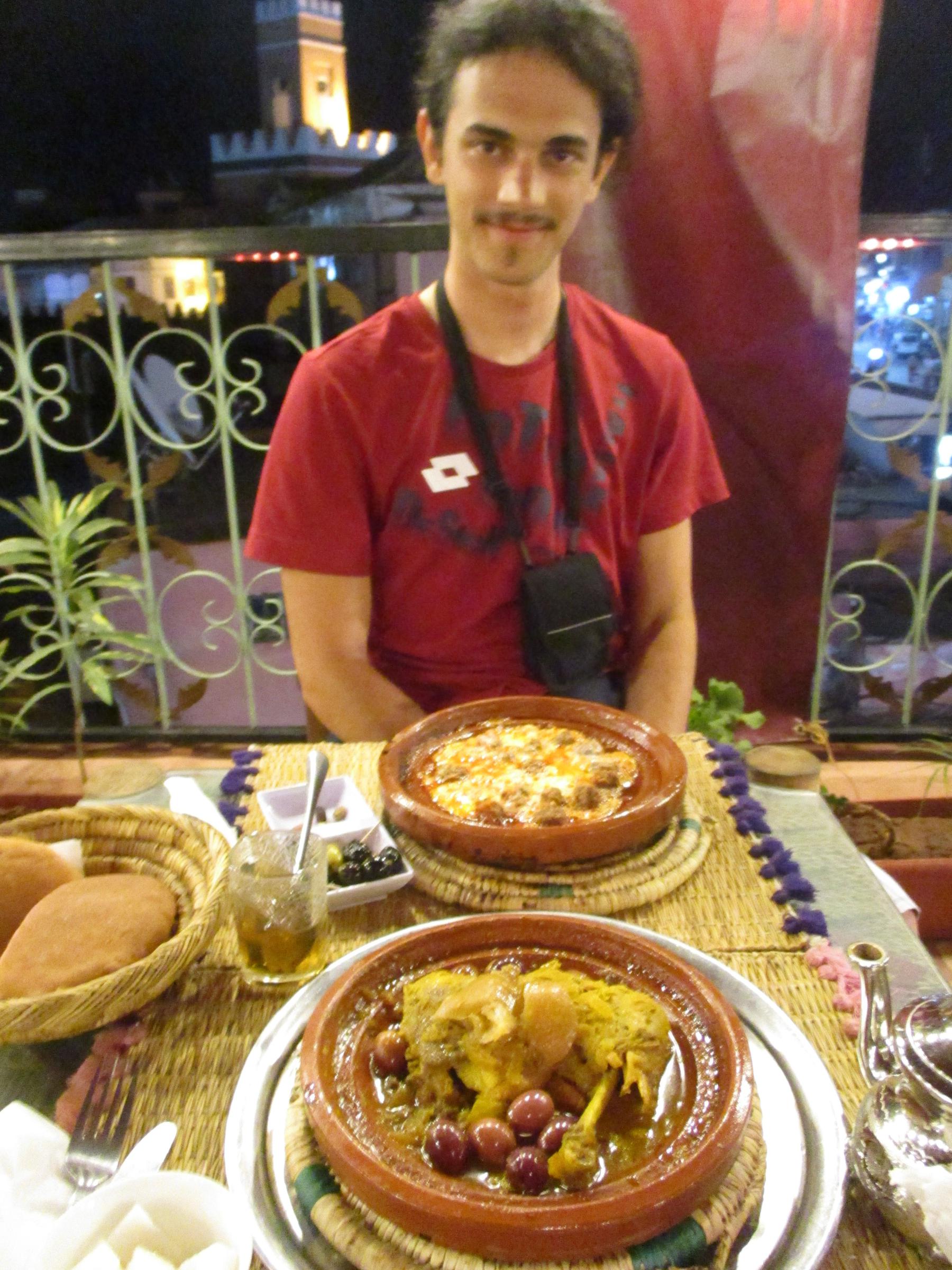 Keď sa ubytujeme ideme skúsiť zohnať niečo na večeru. Odhodláme sa vyskúšať niečo typické marocké. Ako tak hľadáme zastaví nás jeden mladík, že ak hľadáme jedlo, tak nám môže ukázať jednu reštiku. Zaviedol nás kúsok, vyšli sme sa druhé poschodie a už len z pohľadu na personál bolo vidieť, že bol reklama. Keď už sme tam boli, dali sme si typický marocký Tadžín za 90 dirhamov. Keď sme vyšli von, hneď v prvej reštaurácii ktorú sme videli ho mali za 35 :D. Po ceste späť do hostela sa s Thibom bavíme čo budeme robiť nasledujúci deň, lebo zatiaľ nemáme nič na pláne. Thibov sen v Maroku je ísť na púšť a voziť sa na ťave. Pre mňa je to tiež zaujímavé. Dopredu sme si nič nezarezervovali, tak som ani nedúfal, že niekam pôjdeme. Po ceste do hostela zrazu zbadáme stánok podobný nejakej cestovke. Ideme sa tam spýtať, čo nám môžu ponúknuť. Pokiaľ sme mali len jeden deň, tak ísť na púšť nestíhame. Na to potrebujeme aspoň 3 dni, lebo je to ďaleko. Jediné čo mali na 1 deň, bol výlet Ourika Valley Day Trip za 250 dirhamov. Súhlasili sme s tým, že nás za tú cenu povozia ešte aj na ťavách. Zaplatili sme zálohu 150 dirhamov a šli späť do hostela.