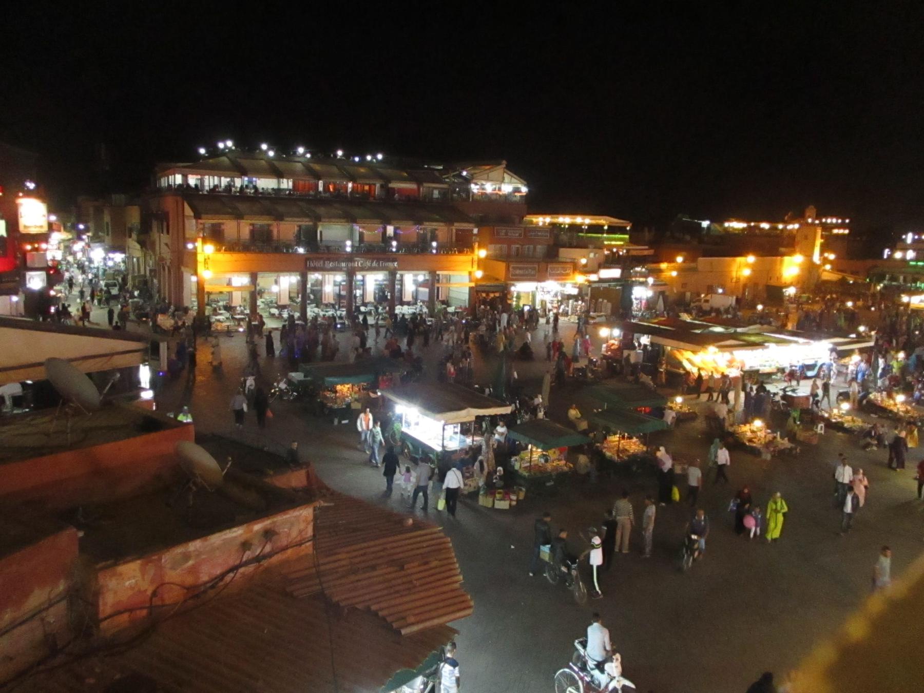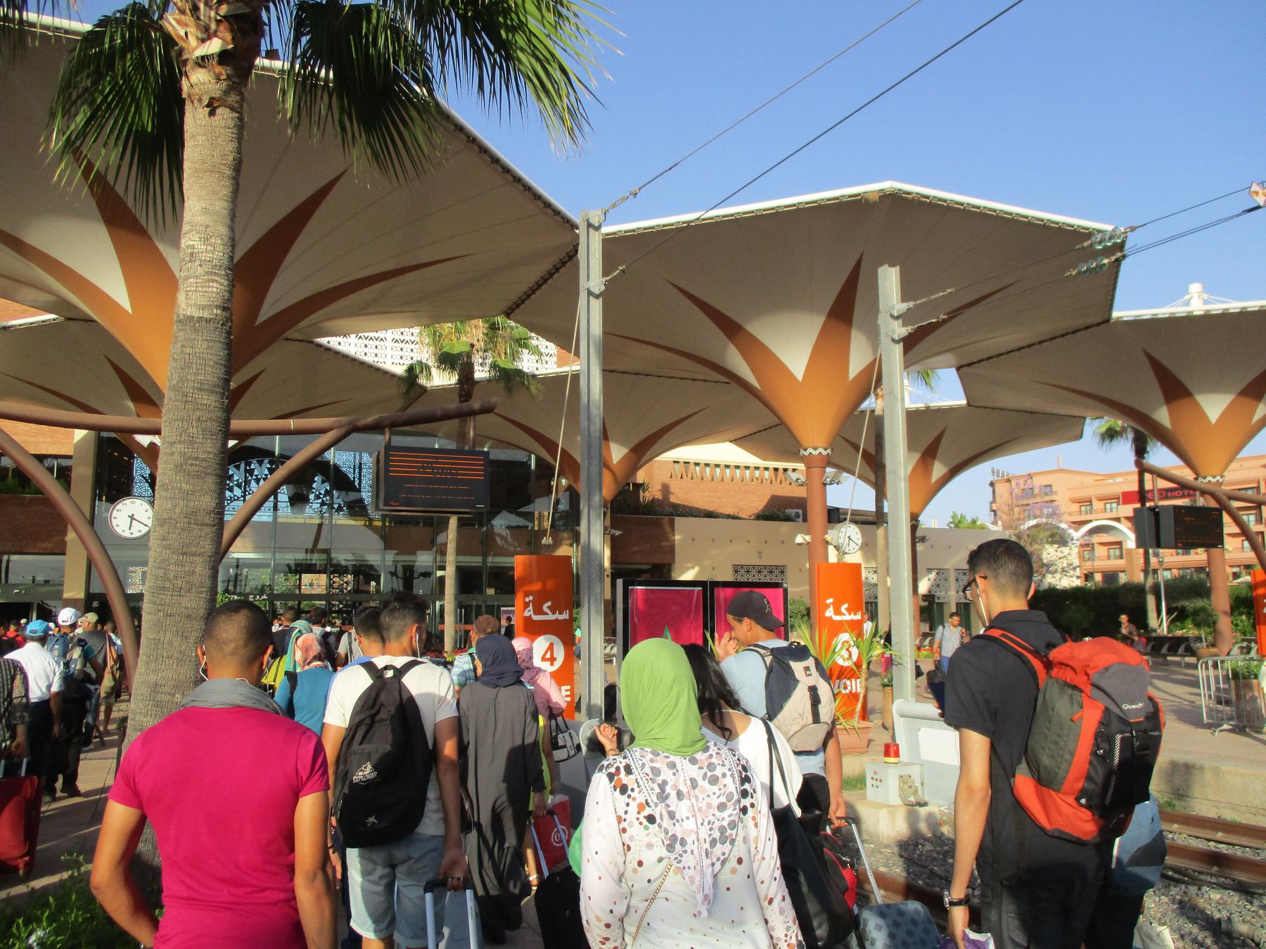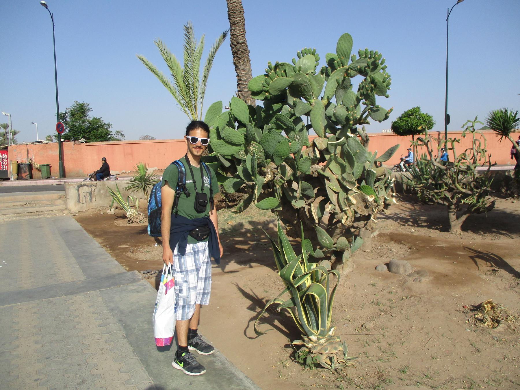 Po nastúpení do vlaku a chvíľke cesty už z okna nevidíme žiadnu zeleň iba samú púšť. Sem tam plantáž kaktusov. Po 4 hodinách cesty vlak zastaví v konečnej stanici Marakéš a my vidíme mesto kde asi iné ako oranžové budovy nie sú. Od železničnej stanice pomaly ideme do centra kde máme booknutý hostel. Po ceste vidíme masívne múry okolo nádherných záhrad a najväčšiu marockú mešitu Koutoubia Mosque. Keď prídeme na obrovské námestie Jemaa el-Fnaa, podľa máp by hostel mal byť len kúsok odtiaľ. Vôjdeme do tržnice a obídeme raz blok, uprostred ktorého by sa náš hostel nachádzať ale nevidíme žiadnu tabuľku ani šípky. Po chvíli nám okoloidúci poradí, že musíme ísť tuto do tejto uzučkej uličky. Bol to ako vchod do bludiska, uzučká cestička, vysoké múry a samé odbočky. Nakoniec to nájdeme a hneď nás víta sympatický mladík, ktorý nám na uvítanie spraví špeciálny marocký nápoj. Po ochutnaní zisťujem, že je to obyčajný žihľavový čaj, ale možno pre nich je žihľava vzácna rastlina.