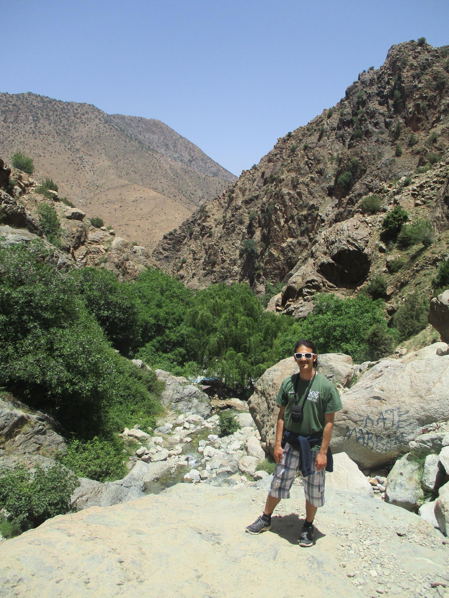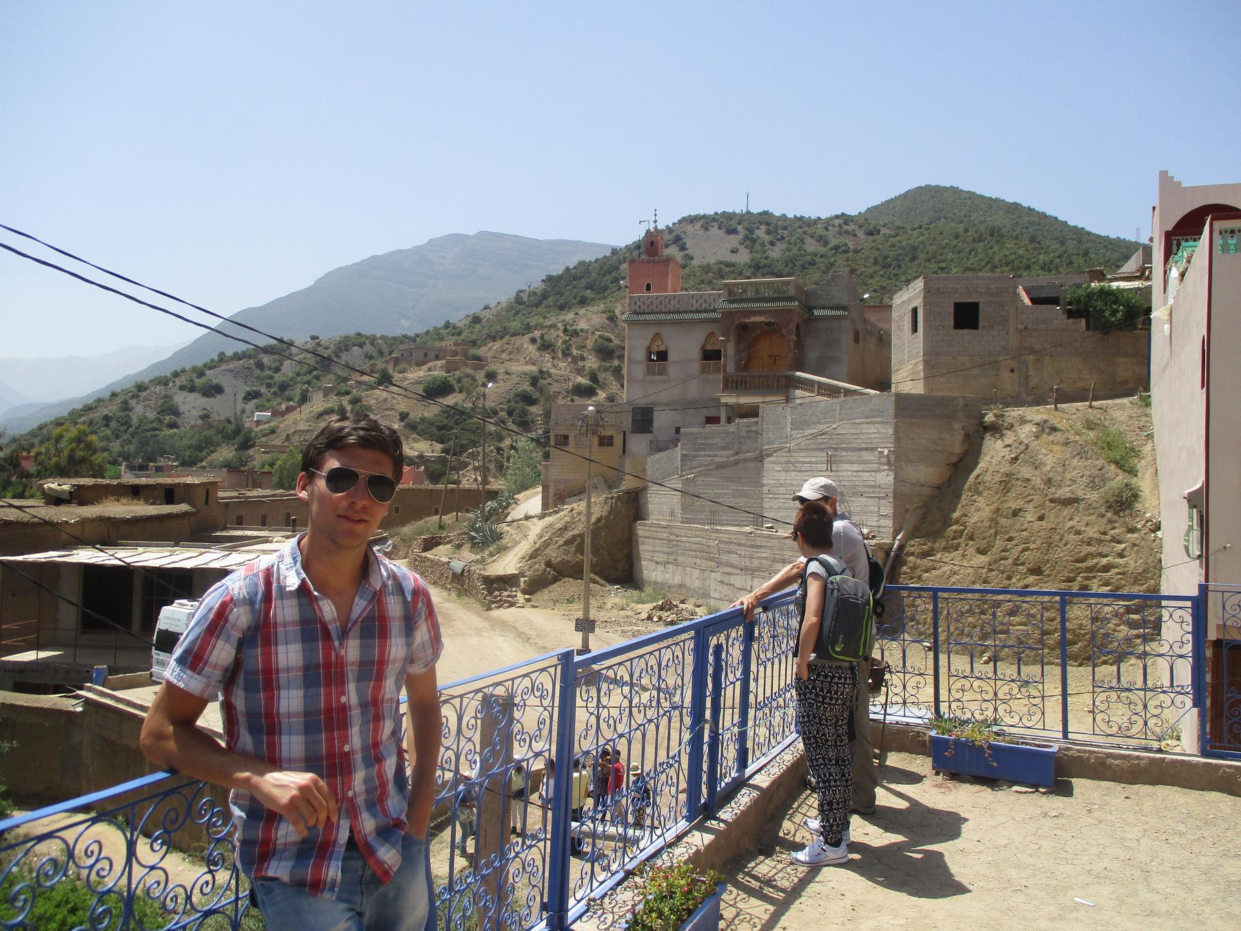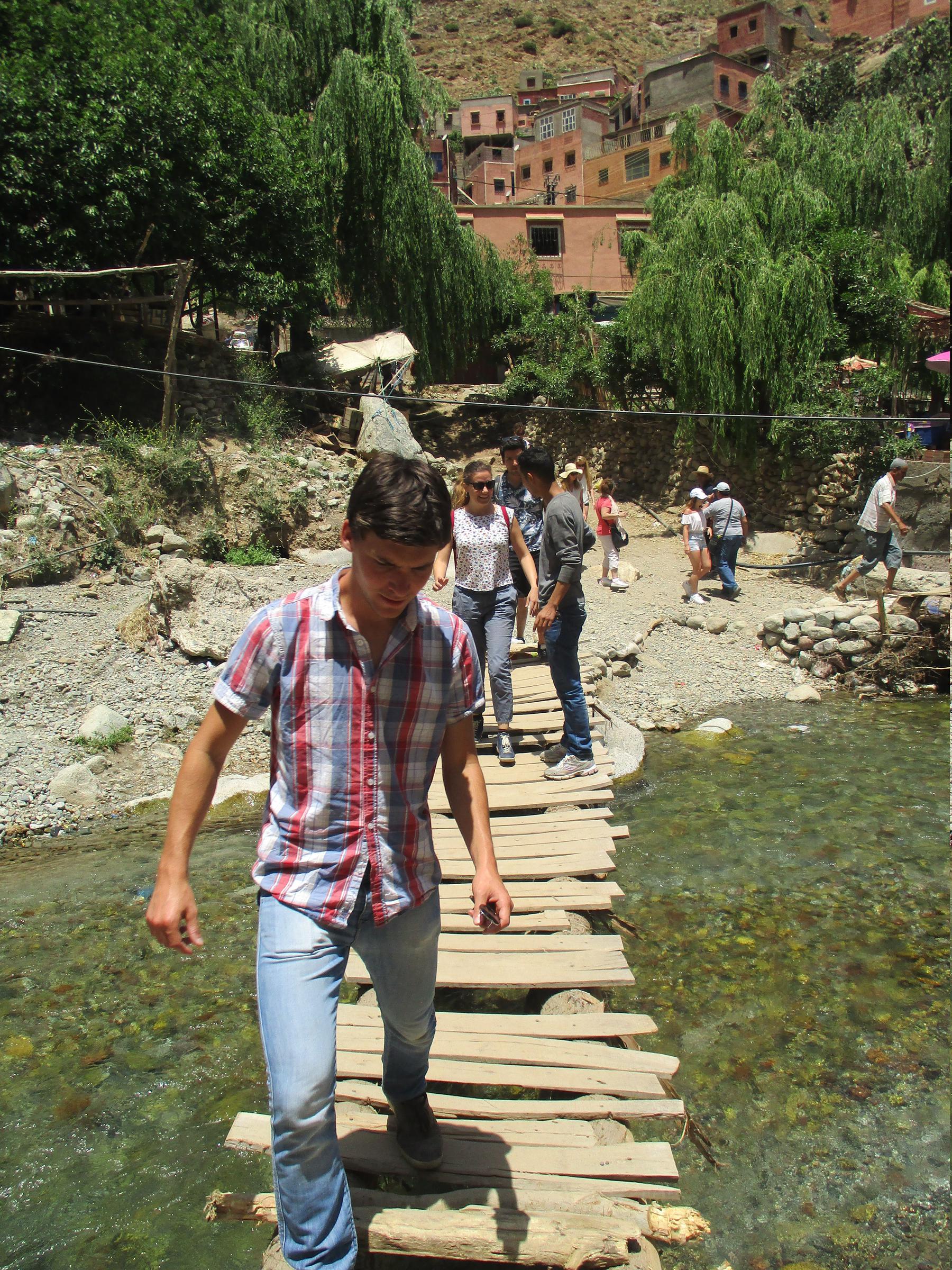O 9 čakáme na danom mieste, príde po nás auto, počkáme ešte na ostatných a keď sme všetci 7, tak vyrážame. Po hodinke cesty sa blížime k horám. Cestou zastavujeme v rôznych workshopoch tradičného marockého života a ich remesiel. Ďalšiu hodinku ideme stále do kopca, cestou zoberieme sprievodcu a o chvíľu sme na mieste. Všetci vystúpime z auta, prejdeme po lavičke cez potok a so sprievodcom ideme po chodníku smerom nahor. Po ceste stretáme dedkov tesajúcich postavičky z kameňa a stánky kde sa dá kúpiť občerstvenie. Úplne na konci je vodopád, kde chvíľu pobudneme a ideme naspäť. Po ceste máme nádherný výhľad na prírodu. Pomaly schádzme dole a o chvíľu sme opäť pri aute. Je čas obeda a preto nás odvezú k jednej reštaurácii nablízku. Trošku sme znechutení z toho, že sme vopred o tom neboli informovaní a tiež, že tam nič iné nemajú, iba Tadžín ktorý sme mali deň pred tým akurát a teraz ešte aj s vysokohorskou prirážkou. Sprievodcovi musíme tiež dať nejaký tip a tiež vo všetkých workshopoch po ceste chodili ľudia s pokladničkami a niekde viac, niekde menej nútili dávať peniaze.