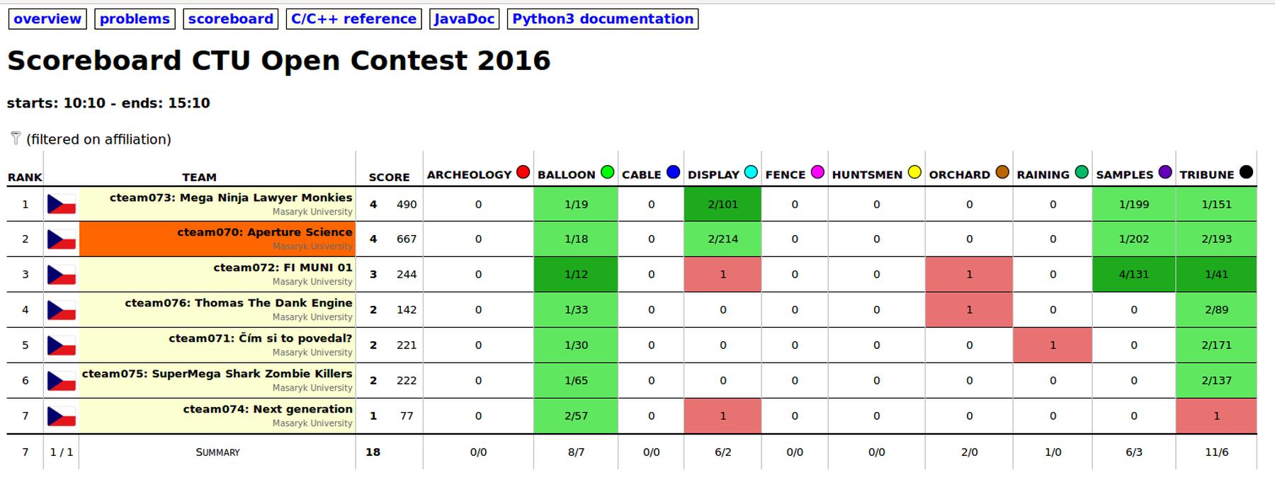 Nasleduje testovacie kolo súťaže, kde si otestujeme technické vybavenie počítačov a doručovaciu službu balónikov. Všetko dávame na prvý submit, keďže sú to tie isté úlohy ako vo warmup-e týždeň predtým. Poslednú úlohu dáva Jodík 90 sekúnd pred zamrazením výsledkovky čo nám zaručilo donášku celej kolekcie 4 balónikov. Ešte pokecáme a pomaly sa zberáme domou.