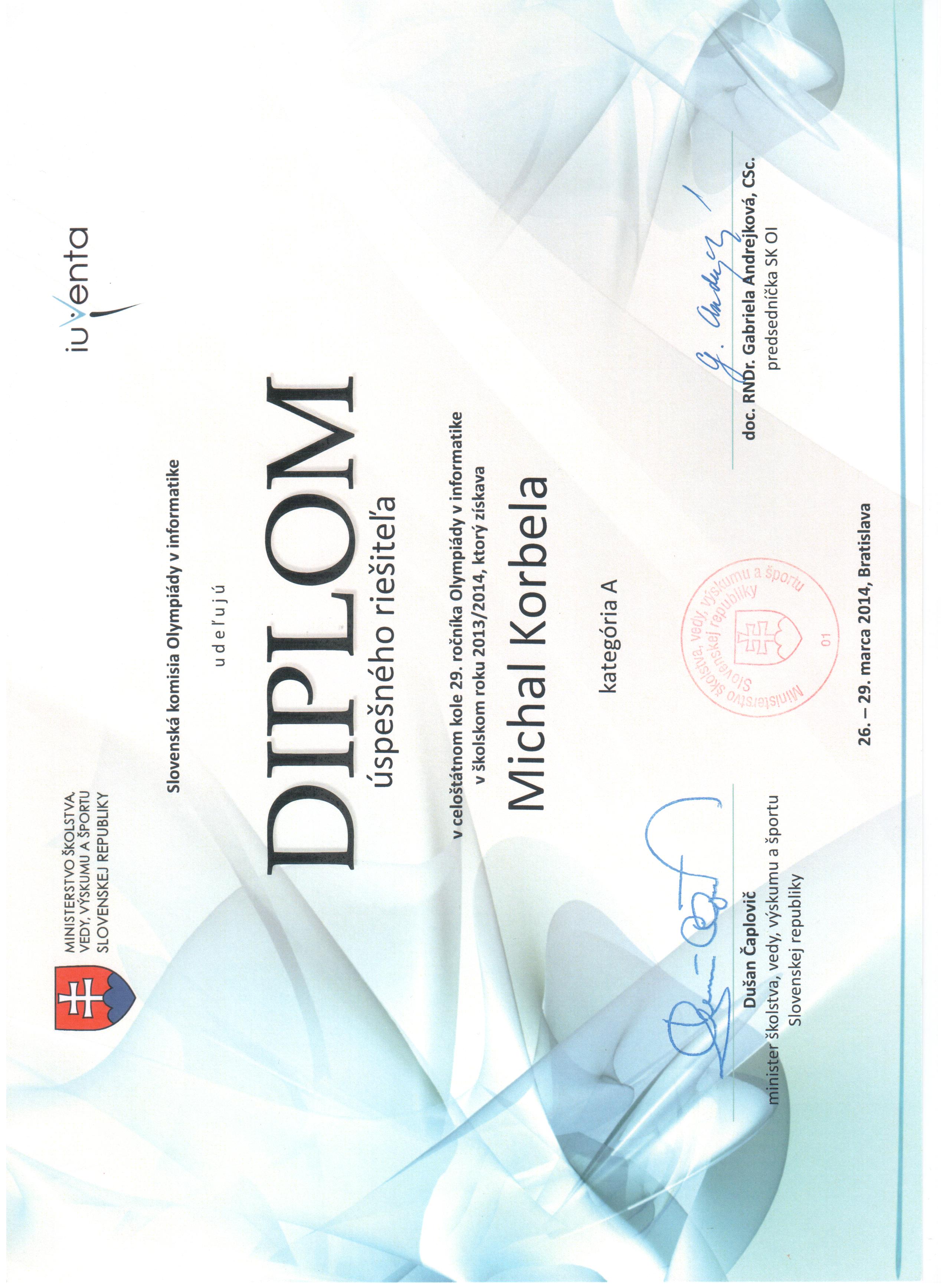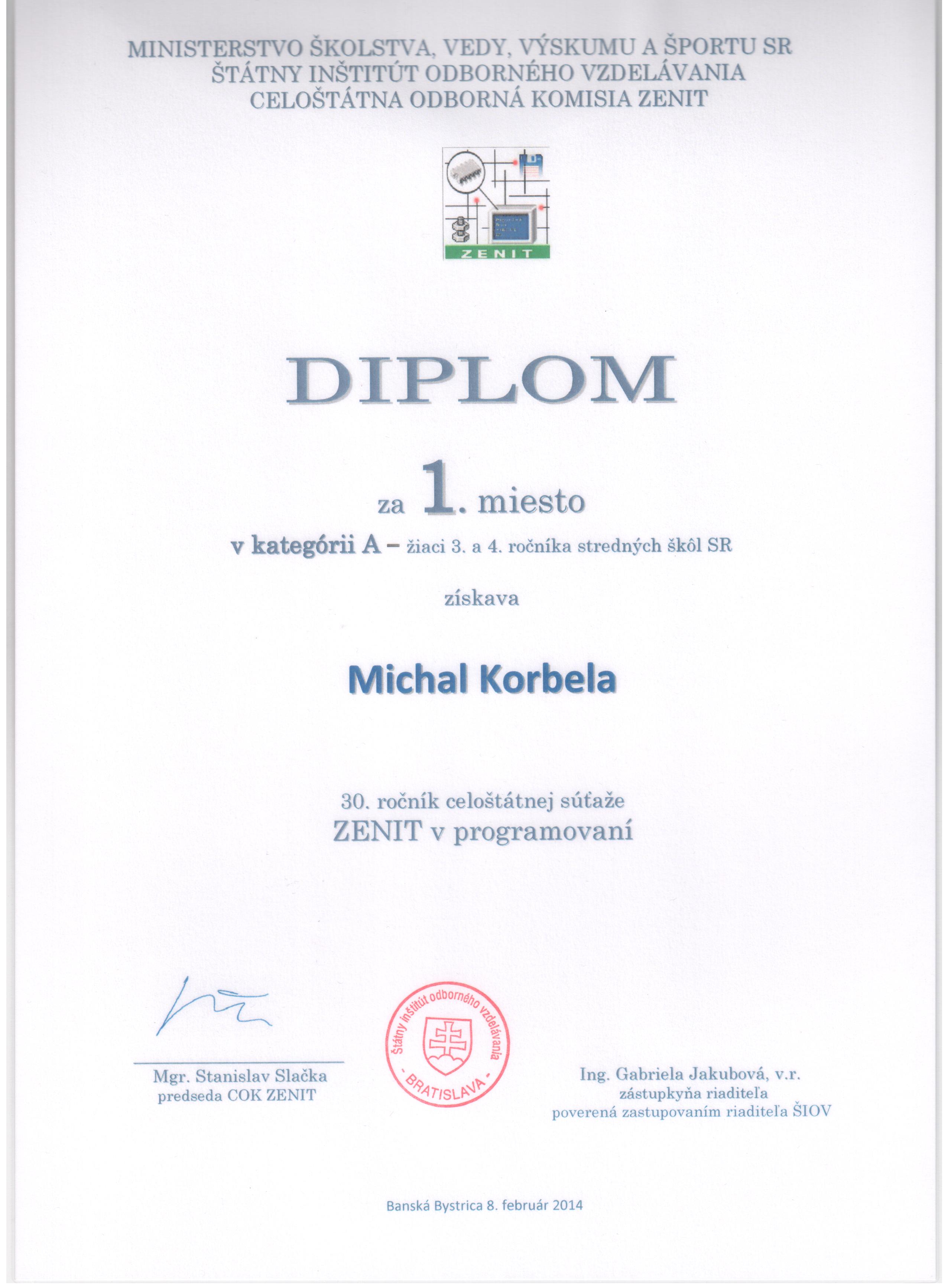 | 2014 | Výberko OI | 4. miesto | Diplom | Postup do CEOI, VPCPC, IOI |